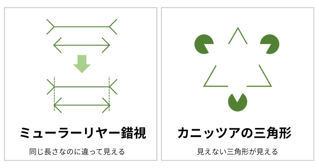 錯視は、「目に映っているのに、脳の解釈によって実際とは異なる見え方が生じる」例の代表です。長さや大きさ、色の知覚が変わって見える現象は、入力の段階ではなく、脳内の処理・解釈の段階で生まれます。